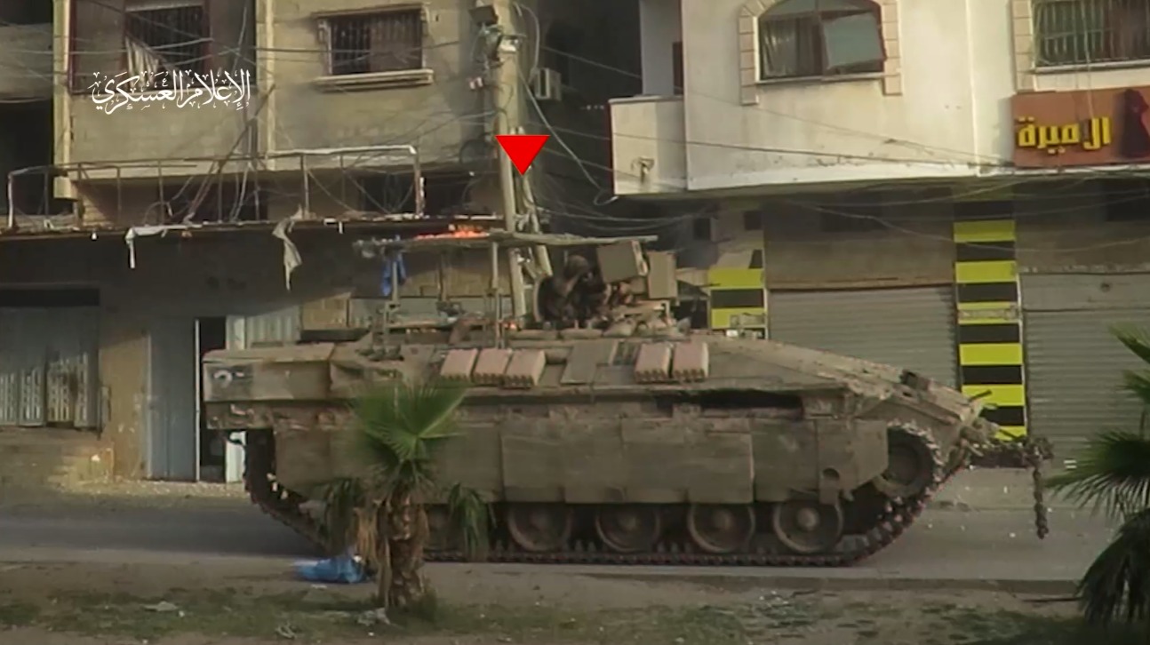 والمثلث الأحمر الموجه للأسفل، هو رمز اعتادت حركة المقاومة الفلسطينية على استخدامه في مقاطعها المصورة التي توثق عملياتها العسكرية ضد جيش الاحتلال الإسرائيلي المتوغل في قطاع غزة.