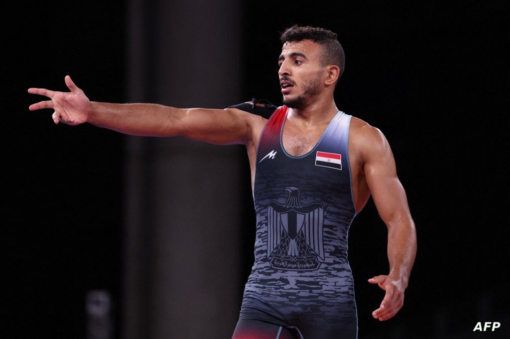 (FILES) Egypt's Mohamed Ibrahim Elsayed reacts after being defeated by Ukraine's Parviz Nasibov in their men's greco-roman 67kg wrestling semi-final match during the Tokyo 2020 Olympic Games at the Makuhari Messe in Tokyo on August 3, 2021. French police early August 8, 2024, arrested an Egyptian wrestler taking part in the Olympics over allegedly groping a woman in a bar, prosecutors said. Authorities detained Mohamed Elsayed, 26, in front of a cafe in the French capital's 13th district at around 5 am after he was accused of "placing a hand on the buttocks of a woman patron", the Paris prosecutor's office said. (Photo by Jack GUEZ / AFP)