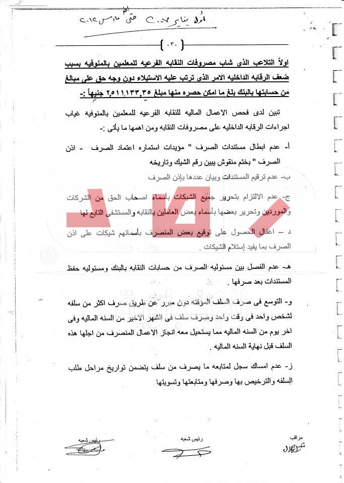 "و لازال عرض المسلسل جاريا في أجزائه التي لا نعرف منتهاها" بهذه الكلمات نوصّف ما حصلت عليه شبكة رصد الإخبارية من تقارير تكشف الفساد المتفشي في نقابة المعلمين الفرعية بمحافظة المنوفية منذ عام 2007 حتى عام 2012و الذي يقدر قيمته 251 مليون و 113 ألف و 335 جنيه .