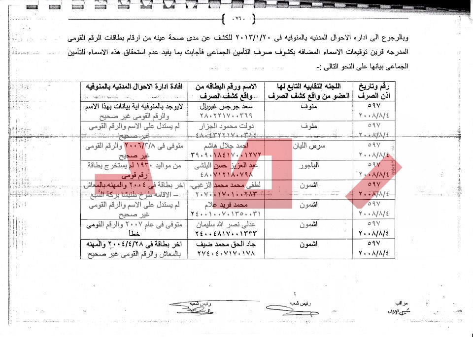 وأوضحت التقارير انه تم الرجوع إلى إدارة الأحوال المدنية بالمنوفية في 20 يناير من العام الحالي للكشف على مدى صحة أرقام بطاقات الرقم القومي المدرجة قرينة توقيعات الأسماء المدرجة بكشوف صرف التأمين الجماعي فأجابت بما يفيد عدم استحقاق هذه الأسماء للتأمين الجماعي .