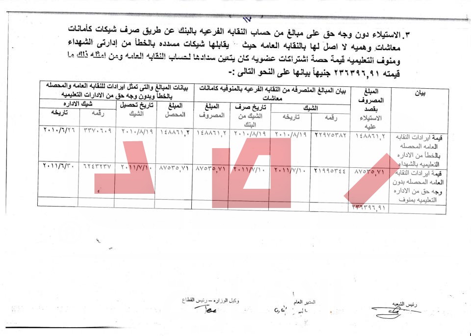 كما استولى المسئولون عن النقابة في هذا الوقت على مبالغ من حساب النقابة في البنك عن طريق صرف الشيكات كأمانات معاشات وهمية لا أصل لها في النقابة العامة حيث يقابلها شيكات مسددة بالخطأ من إداراتي الشهداء ومنوف التعليمية قيمة حصيلة اشتراكات كان يتعين سدادها لحساب النقابة العامة .