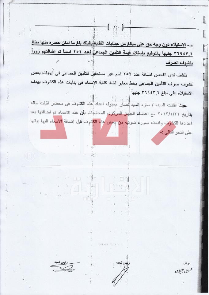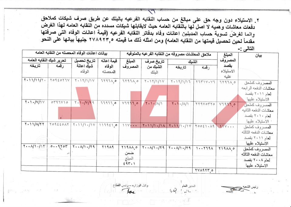 و تكشف التقارير الاستيلاء على مبالغ من النقابة الفرعية بالبنك عن طريق صرف الشيكات كملاحق دفعات معاشات وهمية لا أصل لها بالنقابة العامة حيث لا يقابلها شيكات مسددة من النقابة العامة لهذا الغرض و إنما لغرض تسوية حساب المدينين.