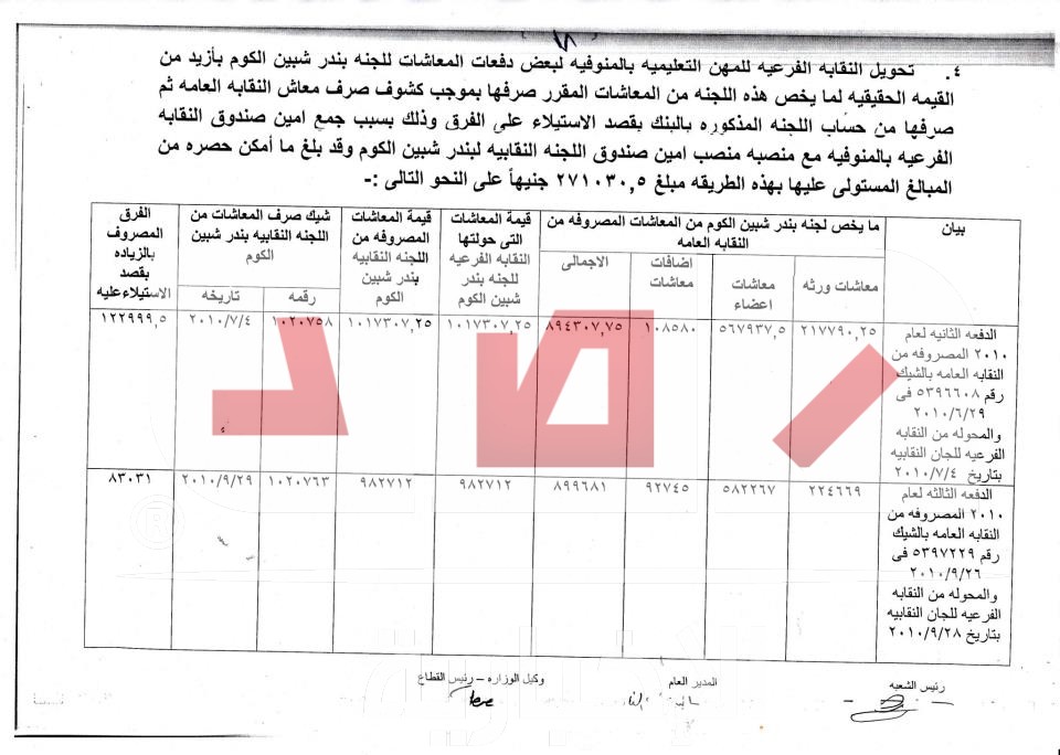 وكشفت التقارير تحويل النقابة الفرعية لبعض دفعات المعاشات للجنة بندر شبين الكوم بأكبر من القيم الحقيقية لما يخص هذه اللجنة من معاشات مقرر صرفها من حسابها بالبنك بغرض