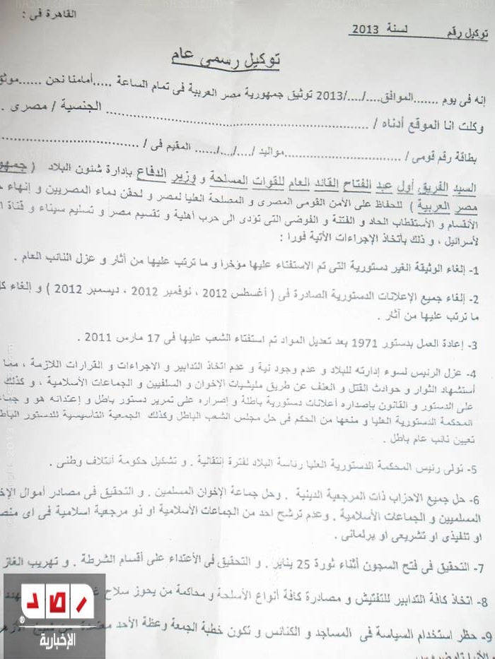 وحصلت"شبكة رصد الإخبارية"على نسخة من التفويض والذي يطالب "السيسى"بإدارة شئون البلاد للحفاظ على الأمن القومي المصري والمصلحة العليا للوطن ولحقن دماء المصريين وإنهاء حالة الانقسام والاستقطاب الحاد والفتنة والفوضى التي تؤدى إلى حرب أهلية وتقسيم مصر وتسليم سيناء وقناة السويس لإسرائيل وذلك باتخاذ الإجراءات الآتية.