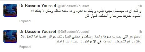 وقال يوسف على صفحته الرسمية:" المعلم هو اللي يضرب ضربة واحدة ويسكت و يخللي العيال تلف حوالين نفسها.اما العيال فلا يملكون غيرالتخبيط و الخوض في الاعراض أو يجيبوا سيرة امك, و قلت ان ده حيحصل.سيبوه يشوه و يشتم.ده اخره و ده تمامه.شكله وحش لا يملك الا الشتيمة.ضربنا ضربتنا و أسقطناه كغيار قذر".