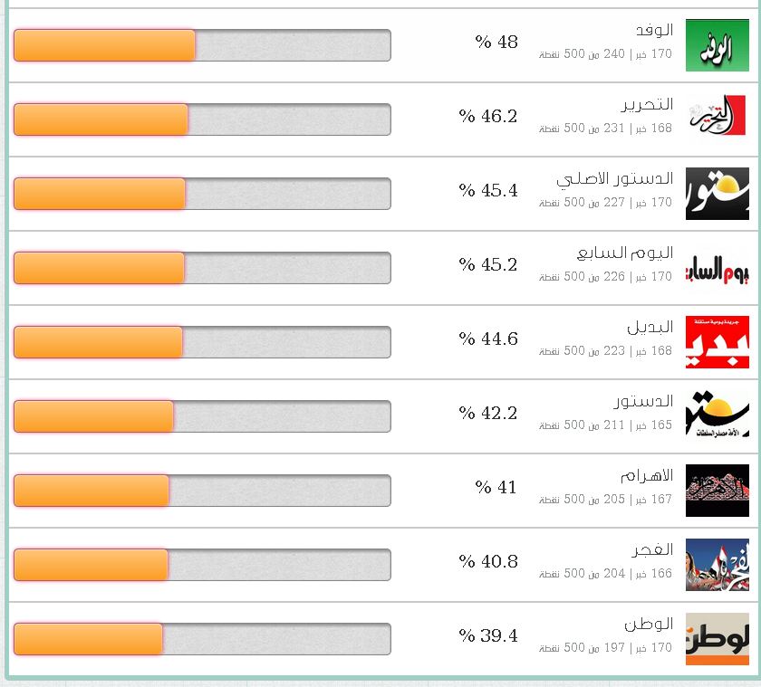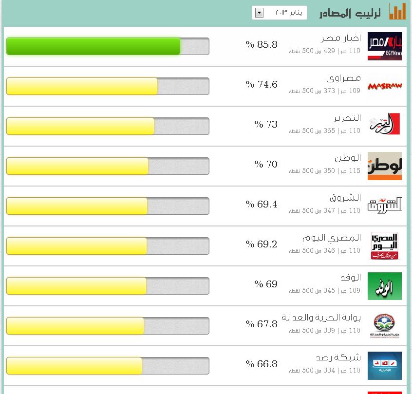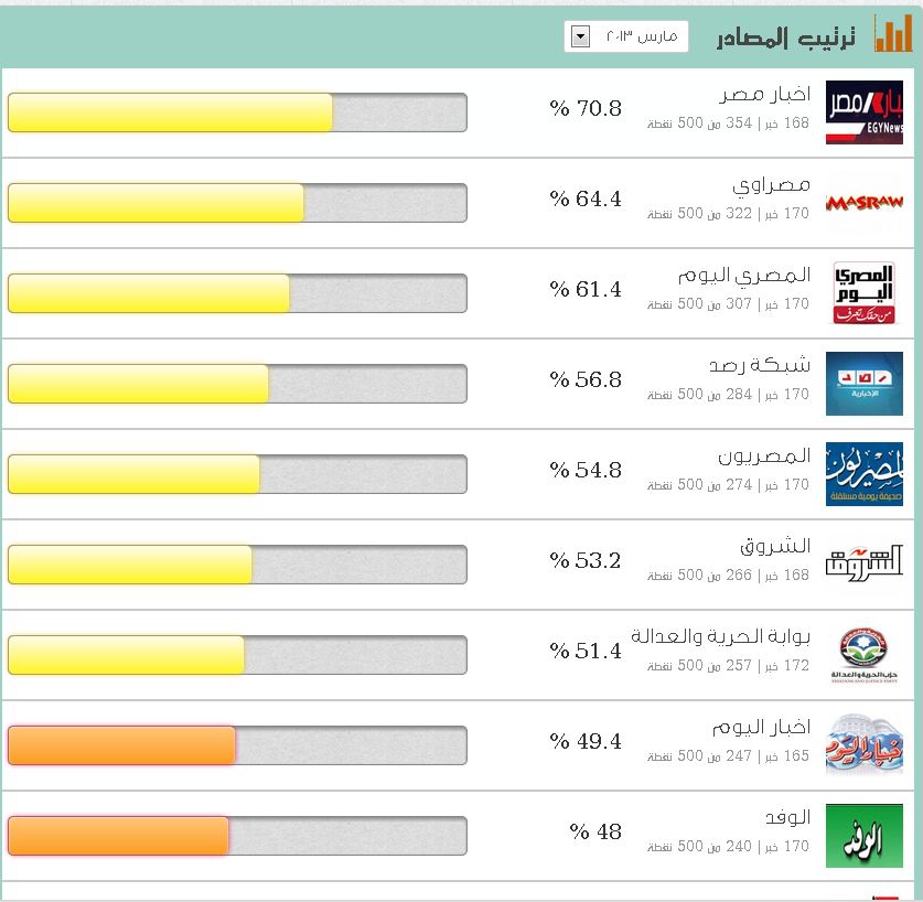 وسجل تقرير مؤشر مصداقية الإعلام المصري عن شهر مارس المنصرم تصدر كلا من موقع أخبار (70.8%) مصراوي (65%) المصري اليوم (61.4%) وشبكة "رصد" الاخبارية ( 56.8%) قائمة المواقع الأكثر مصداقية علي التوالي، فيما احتلت مواقع البديل، ثم اليوم السابع، فالدستور ، والأهرام، والفجر وآخرهم الوطن مؤخرة القائمة (39.4%) بواقع 197 نقطة من أصل 500باعتباره أقل المواقع مصداقية.