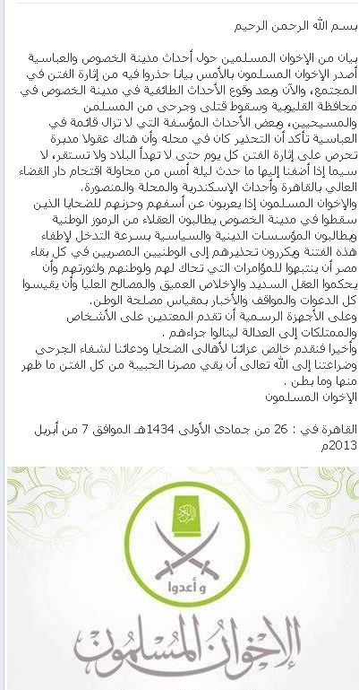أعربت جماعة الإخوان المسلمين عن أسفها وحزنها لسقوط ضحايا، ومصابين مدينة الخصوص، مؤكدة على ضرورة انتباه المصريين إلى المؤامرات على الوطن والثورة.
