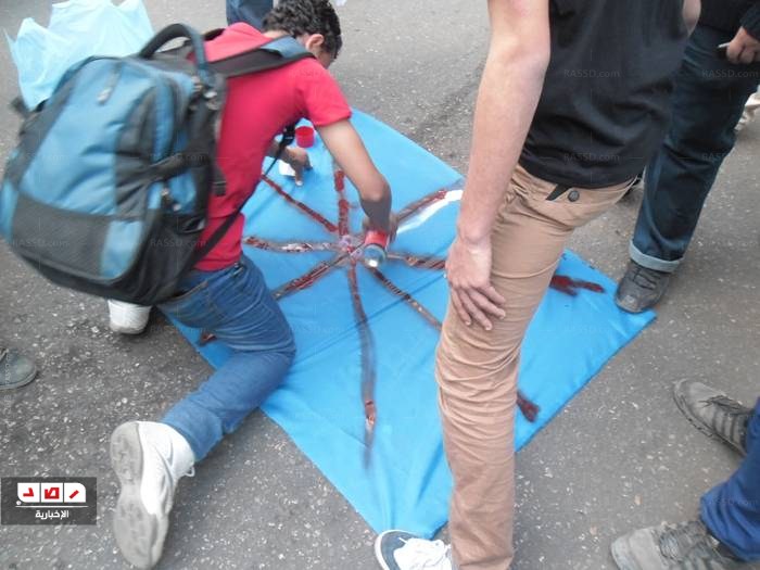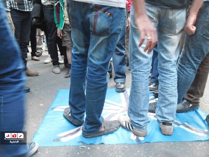 كما قام المتظاهرون برسم العلم البريطاني ووضعه تحت أقدامهم مرددين هتافات نطالب بالقصاص كما رددوا هتافات مناوئة لوزارة الداخلية وقوات الأمن المكلفة بحماية السفارة نظرا للتشديدات الأمنية.