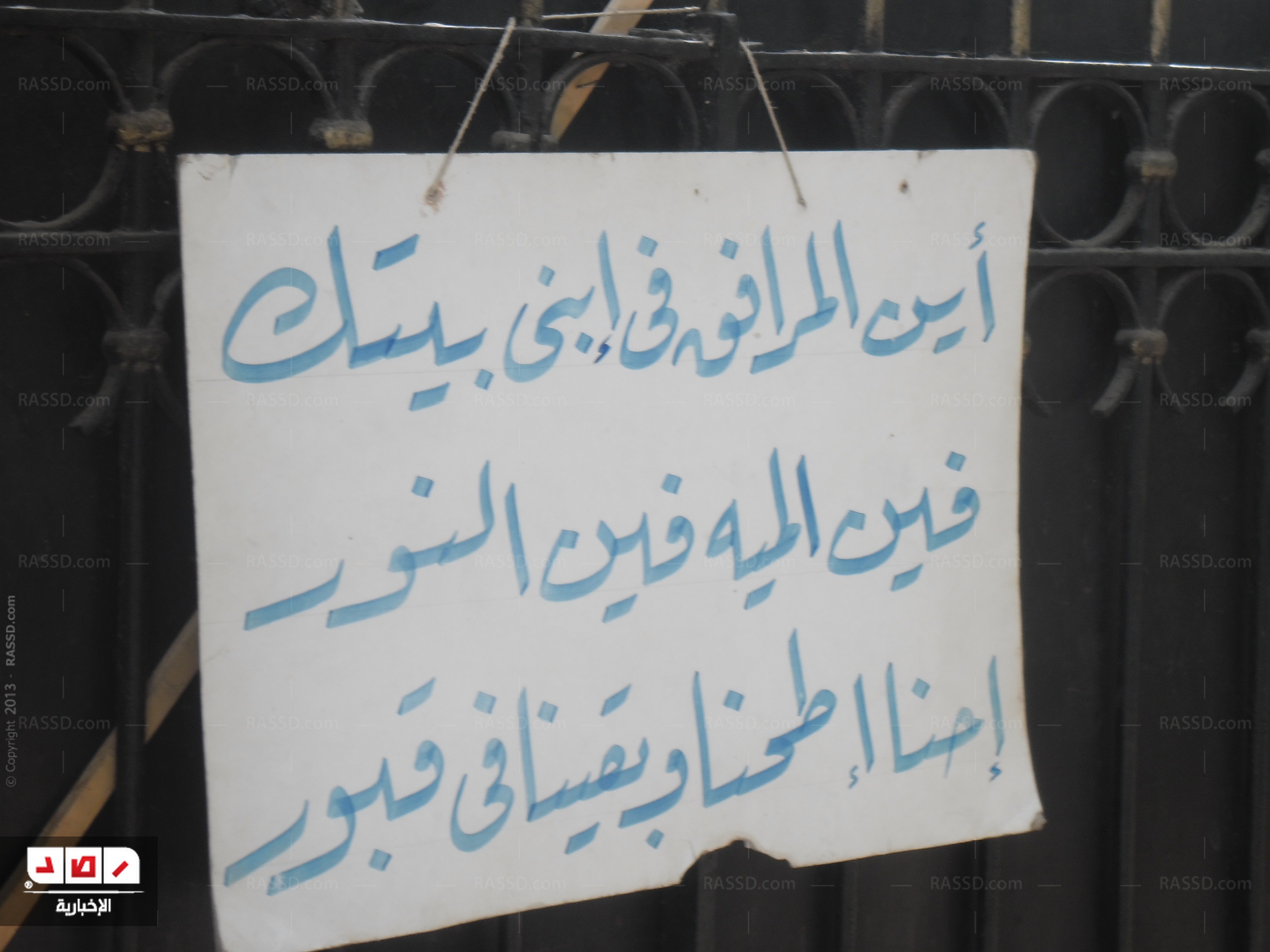 ويطالب المعتصمون بإدخال المرافق لمباني المشروع، كما رفع المعتصمون لافتات كتب عليها "البنية التحتية " بكل لغات العالم وأخرى  أين المرافق في ابني بيتك..فين الميه فين النور إحنا  اطحنا وبقينا في القبور .