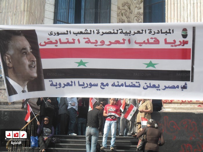 ورفع المتظاهرون إعلام سوريا ومصر كما قاموا بتعليق لافتة كبيرة على سلالم النقابة مرسوم عليها صور الرئيس الراحل جمال عبد الناصر ومكتوب عليها"المبادرة العربية لنصرة الشعب السوري..سوريا قلب العروبة النابض..شعب مصر يعلن تضامنه مع سوريا العروبة".