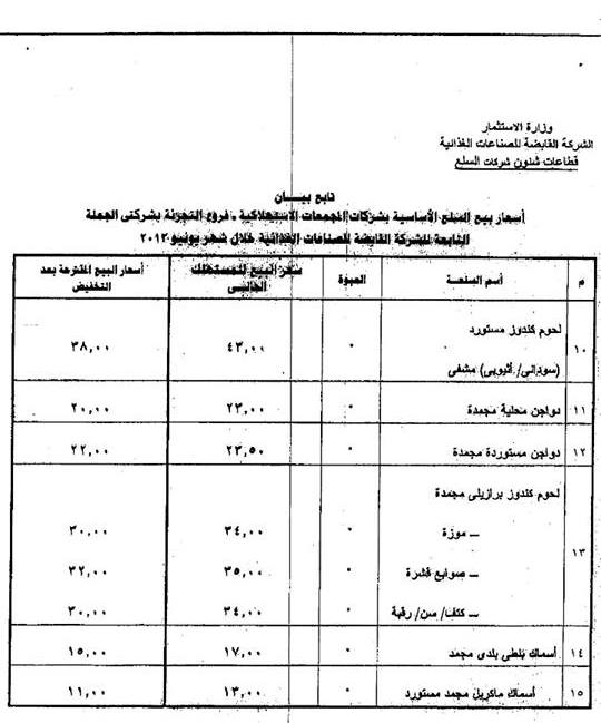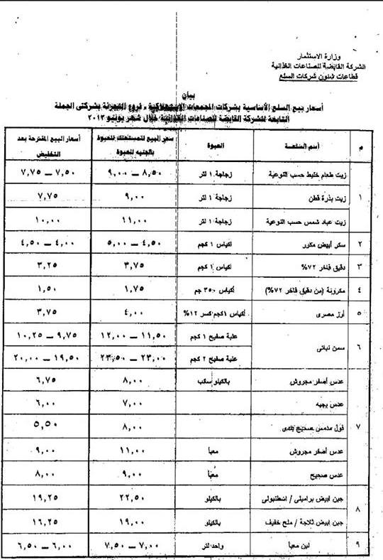 حيث عرضت  الوزارة أسعار مقترحة للسلع الأساسية بعد التخفيض منها أن سعر زيت الطعام الخليط  أصبح بـ 7.50 بعد أن كان 9 جنيهات ، والسكر الأبيض بـ 4 جنيهات بدلا من 5 جنيهات، والدقيق الفاخر بـ3.25 بدلا من 3.75