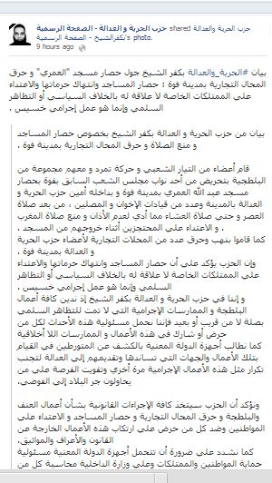 واستنكر الحزب في بيانه حصار المسجد الذي كان بداخله أمين "الحرية والعدالة" بكفر الشيخ وعدد من قيادات جماعة الإخوان المسلمين وبعض المصلين منذ صلاة العصر وحتى صلاة العشاء، مما أدى لمنع الآذان وأداء صلاة المغرب، مشدداً أن حرمة المساجد خط أحمر ولا بد أن تحترم قدسيتها.