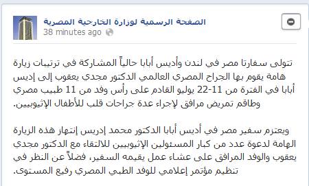 وتشارك سفارتا مصر في لندن وأديس أبابا البدء في ترتيبات الزيارة التي يقوم بها يعقوب إلى العاصمة الإثيوبية أديس أبابا لإجراء عدة جراحات قلب لأطفال أثيوبيا وذلك وفق ما أعلنت وزارة الخارجية عبر صفحتها الرسمية على موقع التواصل الاجتماعي "فيسبوك" اليوم (الأربعاء).