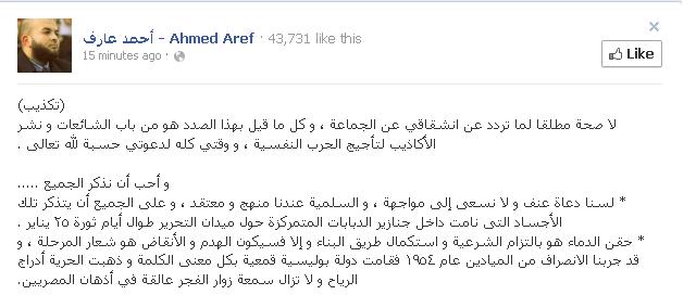وقال على صفحته الشخصية على موقع التواصل الاجتماعي "فيس بوك" إنه " لا صحة مطلقا لما تردد عن انشقاقي عن الجماعة ، و كل ما قيل بهذا الصدد هو من باب الشائعات و نشر الأكاذيب لتأجيج الحرب النفسية ، و وقتي كله لدعوتي حسبة لله تعالى"، على حد قوله .