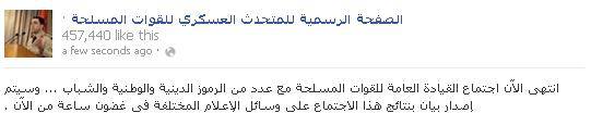 وأضاف المتحدث العسكري  على صفحته الرسمية على موقع التواصل الاجتماعي "فيس بوك"،أنه"سيتم إصدار بيان بنتائج هذا الاجتماع على وسائل الإعلام المختلفة فى غضون ساعة من الآن".