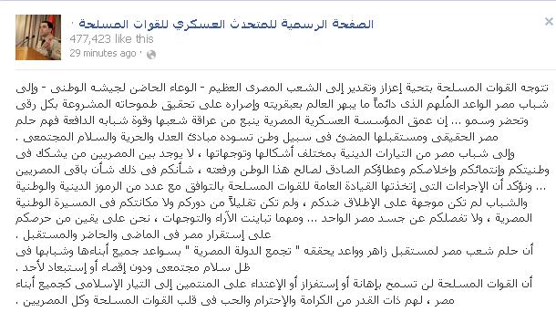 وقالت القوات المسلحة على لسان المتحدث العسكري على صفحته الرسمية على موقع التواصل الاجتماعي "فيس بوك":" وإلى شباب مصر من التيارات الدينية بمختلف أشكالها وتوجهاتها ، لا يوجد بين المصريين من يشكك فى وطنيتكم وإنتمائكم وإخلاصكم وعطاؤكم الصادق لصالح هذا الوطن ورفعته ، شأنكم فى ذلك شأن باقى المصريين" .