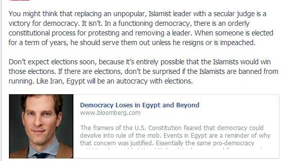 وقال عبر الموقع الإخباري"bloomberg": " قد تعتقد أن استبدال زعيم إسلامي لا يحظى بشعبية بحاكم علماني هو انتصار للديمقراطية, الأمر ليس كذلك. ففي ظل النظم الديمقراطية الفاعلة هناك عملية دستورية منظمة للاحتجاج والإطاحة بحاكم . فعندما يتم انتخاب شخص لمدة يجب أن يستمر فى مهامه خلالها إلا إذا استقال أو جرت مسائلته.  ولا تتوقعو انتخابات قريبا, لأنه من المتوقع بنسبة كبيرة أن يفوز بها الاسلاميون هذا إذا كان هناك انتخابات. ولا تندهشوا إذا منع الاسلاميين من الاستمرار مثل ايران, فامصر ستكون استبدادية مع الانتخابات"