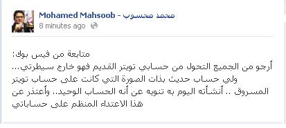 و قال الدكتور محسوب على حسابه الشخصي على موقع التواصل الاجتماعي "فيس بوك "، "أرجو من الجميع التحول من حسابي تويتر القديم فهو خارج سيطرتي… ولي حساب حديث بذات الصورة التي كانت على حساب تويتر المسروق .. أنشأته اليوم به تنويه عن أنه الحساب الوحيد.. وأعتذر عن هذا الاعتداء المنظم على حساباتي".