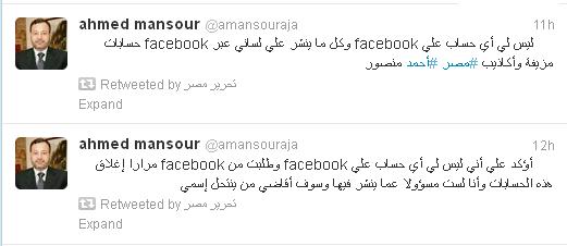 كد الاعلامى أحمد منصورمساء أمس الخميس أنه ليس له حسابات على موقع التواصل الاجتماعي "فيس بوك"، و ليس له سوى حسابه على موقع "تويتر" للتدوينات القصيرة .