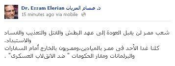 كما قال في تدوينته مساء (اليوم) على الفيس بوك " كلنا غدا الأحد في مصر يالميادين ومصريون بالخارج أمام السفارات والبرلمانات ومقار الحكومات "ضد الانقلاب العسكري"