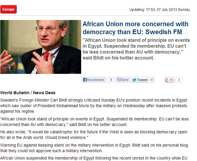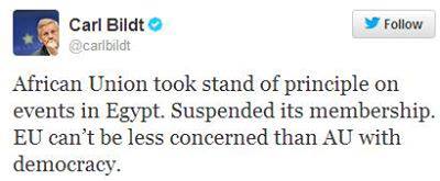 قال كارل بيلدت وزير خارجية السويد إن الاتحاد الأوربي لا يجب أن يكون أقل اهتماما بالديمقراطية من الاتحاد الإفريقي الذي اتخذ قرارا بتعليق عضوية مصر على خلفية الانقلاب العسكري الذي أطاح بالرئيس الشرعي المنتخب محمد مرسي.