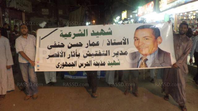 شيع صباح اليوم(الثلاثاء) أهالى محافظة قنا احد شهداء مجزرة الفجر الشهيد”عمار حسن حفنى” -نائب مسؤل المكتب الادارى لمحافظ #قنا- من مسجد العمرى بمدينة قوص وسط هتافات تندد بالمجزرة.