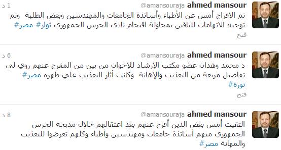 وقال في تغريدة له على موقع التواصل الاجتماعي تويتر "التقيت أمس بعض الذين أفرج عنهم بعد اعتقالهم خلال مذبحة الحرس الجمهوري منهم أساتذة جامعات ومهندسين وأطباء وكلهم تعرضوا للتعذيب والمهانة "