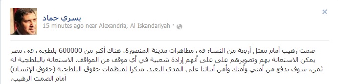 وقال حماد ـ في تعليق له عبر صفحته الرسمية على موقع التواصل الاجتماعي فيس بوك ـ "صمت رهيب أمام مقتل أربعة من النساء في مظاهرات مدينة المنصورة، هناك أكثر من 600000 بلطجي في مصر يمكن الاستعانة بهم وتصويرهم على على أنهم إرادة شعبية في أي موقف من المواقف. الاستعانة بالبلطجية له ثمن، سوف يدفع من أمني وأمنك وأمن أبنائنا على المدى البعيد. شكرا لمنظمات حقوق البلطجية (حقوق الإنسان) أمام الصمت الرهيب".