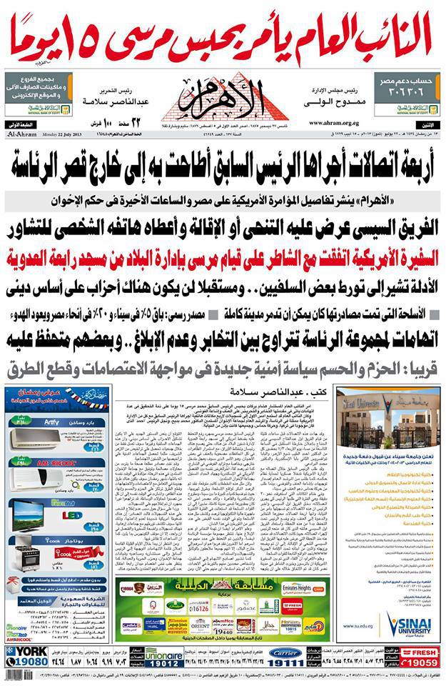 كشفت عن ذلك صحيفة "الأهرام"، في عددها الصادر غداً الاثنين، مؤكدة أن التحقيقات رصدت اتصالات للرئيس بقادة دول أجنبية، وأن السفيرة الأمريكية اتفقت مع المهندس خيرت الشاطر نائب المرشد العام لجماعة الإخوان المسلمين على قيام مرسى بإدارة البلاد من مسجد رابعة العدوية.