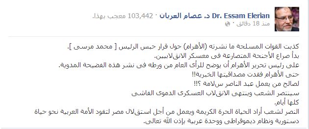 وطالب العريان، عبر صفحته على الفيس بوك،رئيس تحرير الأهرام بالكشف عن من ورطة في نشر هذه "الفضيحة الدموية "، متسائل "لصالح من يعمل عبد الناصر سلامة؟!".