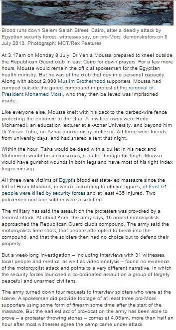 في الساعات الأولى من يوم 8 يوليو، قتلت قوات الأمن 51 من أنصار جماعة الإخوان المسلمين معتصمين أمام نادي الحرس الجمهوري بالقاهرة. إدعى الجيش المصري أن المتظاهرين حاولوا إقتحام المجمع بمعاونة راكبي دراجات بخارية مسلحين.