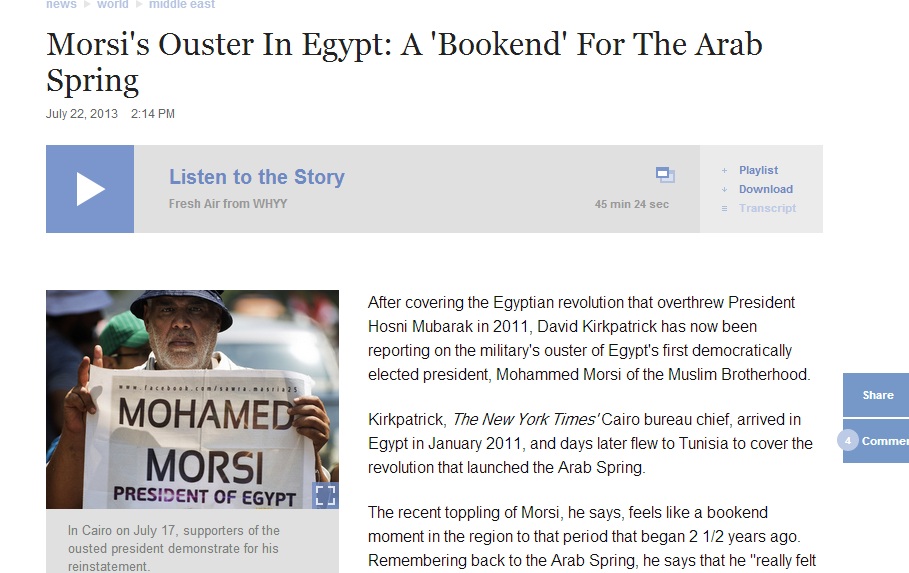 قال ديفيد كيرك باتريك رئيس مكتب القاهرة لصحيفة نيويورك تايمز الأمريكية  إن "إسقاط الرئيس مرسي يبدو وكأنه لحظة النهاية للربيع العربي  في المنطقة، والذي بدأ منذ عامين ونصف.