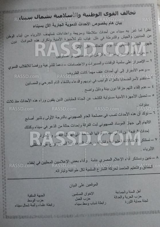 ووقع علي البيان أهل السنة والجماعة وجماعة الإخوان المسلمون، و الجبهة السلفية و حزب الحرية والعدالة، وحزب العمل و حزب الوسط و لجنة حماية الثورة و رابطة شباب وسط سيناءبالإضافة لرابطة علماء وأئمة شمال سيناء.