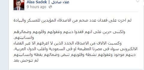 وكتب صادق في صفحته على "فيسبوك" اليوم الثلاثاء: " لم أحزن على فقدان عدد ضخم من الأصدقاء المؤيدين للعسكر والبيادة ولكننى حزين على أنهم فقدوا دينهم وعقولهم وقلوبهم وضمائرهم وإنسانيتهم".