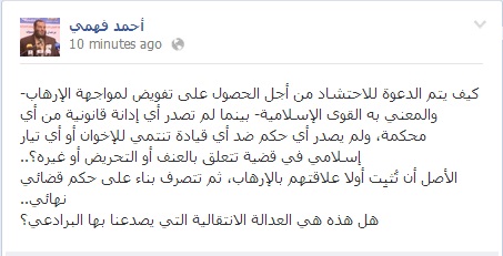 ولفت فهمي إلى أن دعوة السيسي إلى مواجهة ما يصفه بالإرهاب في حين لم تصدر أية إدانة قانونية من أي محكمة، ولم يصدر أي حكم ضد أي قيادة تنتمي للإخوان أو أي تيار إسلامي في قضية تتعلق بالعنف أو التحريض.