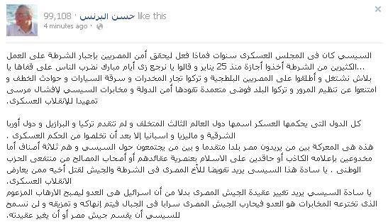 وأضاف البرنس، عبر حسابه على الفيس بوك، أن الفريق عبد الفتاح السيسي، وزير الدفاع، يريد تغيير عقيدة الجيش ليتحول من العداء لإسرائيل لعداء الإرهاب المزعوم ينهك به الجيش ويمزقه، مشددًا على أنه لن يتم السماح له بتقسيم الجيش وتغيير عقيدته.