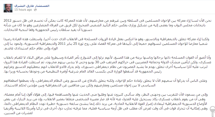 وقال البشري عبر الصفحة الشخصية على موقع التواصل الاجتماعي فيس بوك اليوم الخميس : "أتصور أن القوات المسلحة ذاتها بريئة من هذا الصنيع، لأنهم نزلوا إلى الشوارع بأمر القيادة وسيطروا على مرافق البلاد لا للقيام بانقلاب عسكرى، ولكن لتأمين منشآت الدولة وجموع المصريين فى حراكهم المرتقب فى 30 يونيو، وحتى لا يندس بينهم مخربون، ثم استغلت القيادة هذا النزول لترتب عليه آثارا سياسية أخرى تتعلق بهدم ما يشيد المصريون من نظام ديمقراطى دستورى".