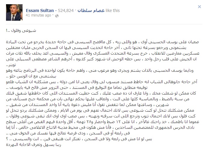 وقال سلطان: "صعبان على يوسف الحسينى أوى ، هو واللى زيه ، كل ماافضح السيسى فى حاجة جديدة يخرجوا من تحت البيادة يشتمونى ويرجعو بسرعة تحتها تانى ، آخر حاجة اتحديت السيسى فيها أن السجن الحربى مليان معتقلين عسكريين معارضين للانقلاب ، خرج بسرعة المتحدث العسكرى وقال مفيش ، والسيسى اعد يحلف بالله تلات مرات ان الجيش على قلب رجل واحد ، بس حظه الوحش ان شهود كتير كذبوه ، آخرهم الشاعر مصطفى السبيلى على تويتر.