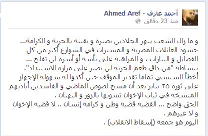 وأضاف عارف عبر صفحته الرسمية علي موقع "الفيسبوك" أن حشود العائلات المصرية و المسيرات في الشوارع أكبر من كل الفصائل و التيارات ، و المراهنة على يأسه أو أسره لن تفلح …ببساطة "من ذاق طعم الحرية لن يصبر على مرارة الاستبداد".
