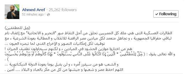وأضاف عارف خلال صفحته الشخصية على موقع التواصل الاجتماعي " فيس بوك" أن هناك تجاهل متعمد لكل ميادين مصر الرافضة للانقلاب و المطالبة بعودة الشرعية ، مع توظيف لكل إمكانيات التصوير و الإخراج الفني لما تبصره العيون.