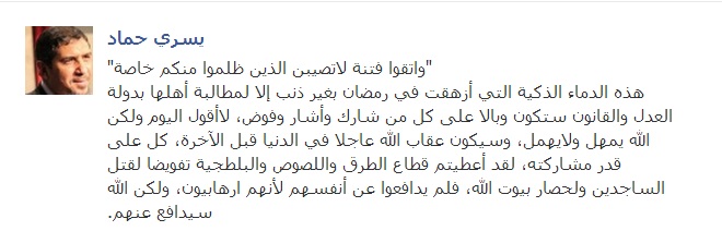 وقال حماد ـ في تعليق له عبر صفحته على موقع التواصل الاجتماعي فيس بوك بعنوان ـ واتقوا فتنة لاتصيبن الذين ظلموا منكم خاصة ـ " هذه الدماء الذكية التي أزهقت في رمضان بغير ذنب إلا لمطالبة أهلها بدولة العدل والقانون ستكون وبالا على كل من شارك وأشار وفوض ، لا أقول اليوم ولكن الله يمهل ولايهمل ، وسيكون عقاب الله عاجلا في الدنيا قبل الآخرة، كل على قدر مشاركته ، لقد أعطيتم قطاع الطرق واللصوص والبلطجية تفويضا لقتل الساجدين ولحصار بيوت الله ، فلم يدافعوا عن أنفسهم لأنهم ارهابيون، ولكن الله سيدافع عنهم".