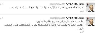 طالب عمرو موسى ،المرشح السابق لرئاسة الجمهورية ، كل من الحكومة والشرطة والقوات المسلحة بسرعة عرض المعلومات على الشعب بخصوص ما حدث فجر اليوم السبت.