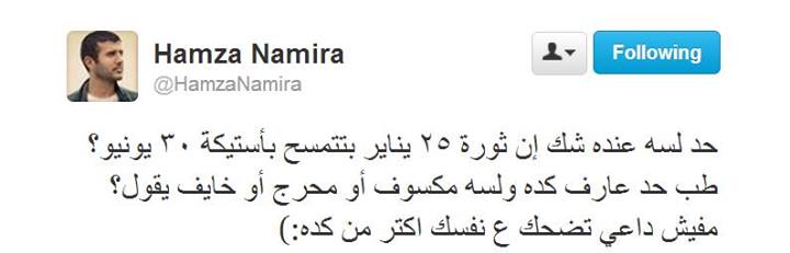 وقال نمرة ـ عبر حسابه على تويتر ـ "حد لسه عنده شك إن ثورة ٢٥ يناير بتتمسح بأستيكة ٣٠ يونيو؟ طب حد عارف كده ولسه مكسوف أو محرج أو خايف يقول؟ مفيش داعي تضحك ع نفسك أكتر من كده".