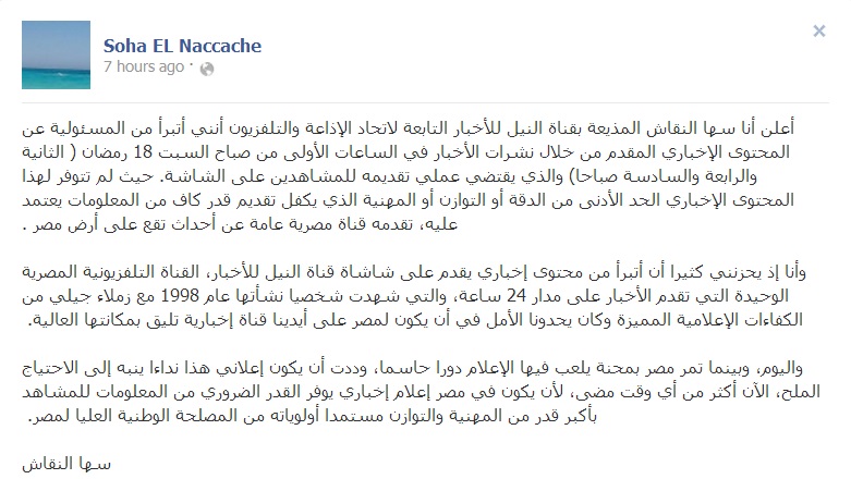 وأضافت "وأنا إذ يحزنني كثيرا أن أتبرأ من محتوى إخباري يقدم على شاشة قناة النيل للأخبار ، القناة التلفزيونية المصرية الوحيدة التي تقدم الأخبار على مدار 24 ساعة، والتي شهدت شخصيا نشأتها عام 1998 مع زملاء جيلي من الكفاءات الإعلامية المميزة وكان يحدونا الأمل في أن يكون لمصر على أيدينا قناة إخبارية تليق بمكانتها العالية".