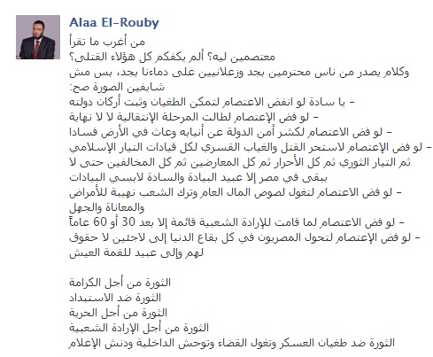 وختم الروبي تدوينته على موقع التواصل الاجتماعي فيس بوك بقوله: لو فض الإعتصام لتحول المصريون في كل بقاع الدنيا إلى لاجئين لا حقوق لهم وإلى عبيد للقمة العيش.