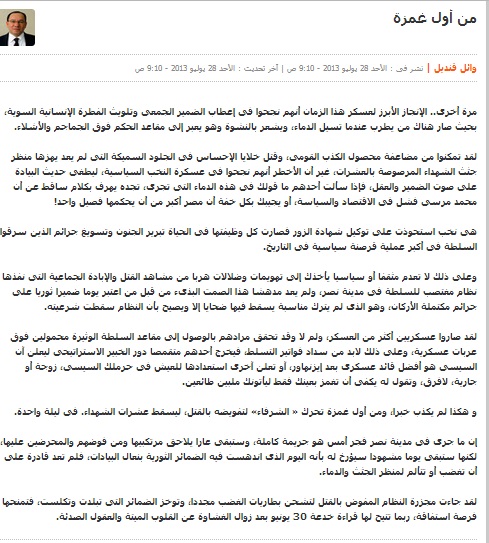 صرح الكاتب الصحفي وائل قنديل بأن ما جرى في مدينة نصر فجر أمس هو جريمة كاملة ، وستبقى عارا يلاحق مرتكبيها ومن فوضهم والمحرضين عليها، لكنها ستبقى يوما مشهودا سيؤرخ له بأنه اليوم الذي اندهست فيه الضمائر الثورية بنعال البيادات، فلم تعد قادرة على أن تغضب أو تتألم لمنظر الجثث والدماء.