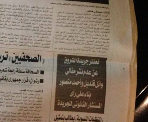 وقالت النسخة الورقية للصحيفة في عددها غدا الاثنين 28 يوليو: " تعتذر جريدة الشروق عن عدم نشر مقالي وائل قنديل وأحمد منصور بناء على رأي المستشار القانوني للجريدة.