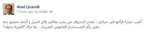 وعلق قنديل في حسابه على موقع فيسبوك للتواصل الاجتماعي اليوم الأحد: " أغرب عبارة قرأتها في حياتي: تعتذر الشروق عن نشر مقالي وائل قنديل وأحمد منصور بناء على رأي المستشار القانوني للجريدة".