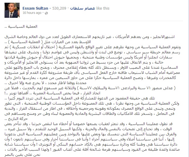( وتابع سلطان: "عدلى منصور ٧١ سنة والبرادعى ٧١سنة والببلاوى ٧٧سنة ) والثلاثة غير مسموح لهم بالحديث ، فضلا عن اتخاذ القرار ، فيما يخص السياسة المصرية .. أقصاها تويتر..!تلك هى حقيقة المقصود من الدعوة للمشاركة فى العملية السياسية التى تتردد اليوم كثيرا.