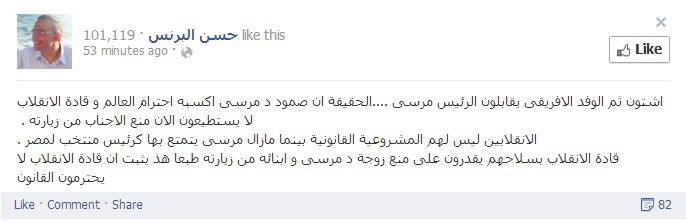وأشار البرنس، عبر الفيس بوك، إلى أن كلا من كاثرين آشتون، ممثل السياسية الخارجية بالاتحاد الأوروبي، والوفد الإفريقي يقابلون مرسي، وقادة الانقلاب لا يستطيعون منعهم، مشددًا على أن قادة الانقلاب، الذين يمنعون أسرة الرئيس من زيارته، لا يحترمون القانون.